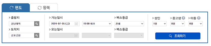예약 방법은 간단합니다. 먼저 출발지와 도착지를 선택한 후, 가는 날과 오는 날, 인원수를 입력하면 됩니다.
