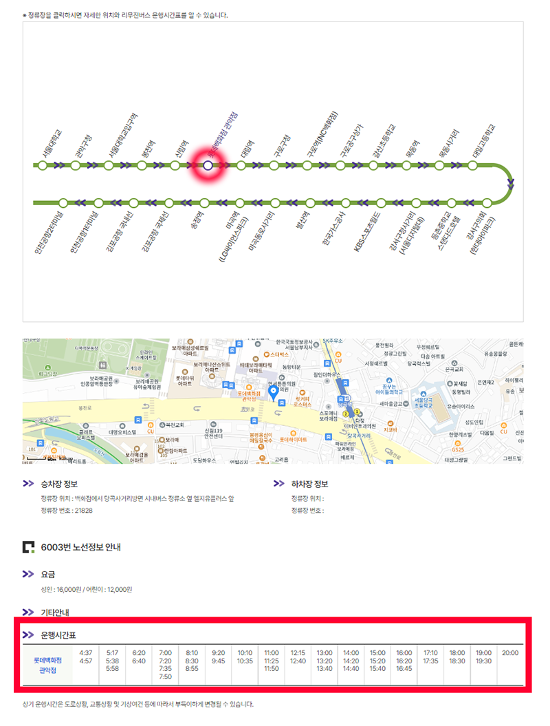 4. 페이지 하단부분에 그 정류장에 언제 버스가 도착하는지에 대한 리무진버스 운행시간표를 보실수 있습니다.