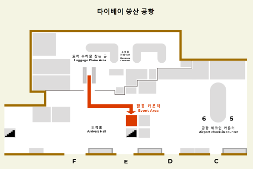 타오위안 국제공항(제1청사 및 제2청사), 타이베이 송산 공항, 타이중 국제공항, 가오슝 국제공항 등 주요 공항에 이벤트 데스크가 운영되고 있으니 본인이 도착하는 공항에 미리 위치를 확인하는 것이 좋습니다.
