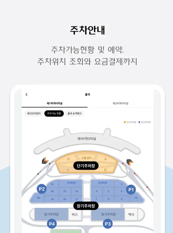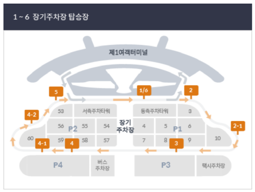 P1 장기주차장, P2 장기주차장, P3 장기주차장, P4 장기주차장 이렇게 4군대의 장기주차장이 인천공항 제1여객터미널에 있습니다.