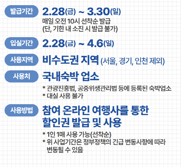 이번 행사는 국내 관광 활성화를 위해 기획된 특별 이벤트로, 비수도권 숙박 시설에서 사용할 수 있는 3만 원 숙박 할인권을 30만 장 선착순 배포합니다.