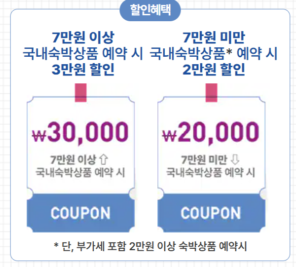 - 2만 원 이상~7만 원 미만 숙박 예약 시: 2만 원 할인